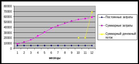 Точка безубыточности находится в координатах Х-месяц = 11,8; У-стоимость = 59000. В этой точке еще не имеет прибыли, но уже не несет убытков. Показатели эластичности показывают как изменяется проект при изменении одного показателя и неизменности остальных. Рискованность проекта находится в промежутке от 101 до 160 (115,8) – это значит, что проект среднерискованный.