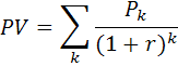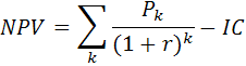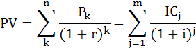 Этот метод основан на сопоставлении величины исходной инвестиции (IC) с общей суммой дисконтированных чистых денежных поступлений, генерируемых ею в течение прогнозируемого срока. Поскольку приток денежных средств распределен во времени, он дисконтируется с помощью коэффициента r, устанавливаемого аналитиком либо инвестором самостоятельно исходя из ежегодного процента возврата, который он хочет или может иметь на инвестируемый им капитал.