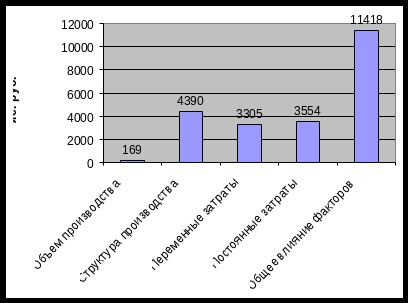 Из расчетов и рисунка 4 ясно, что все факторы привели к росту общей суммы затрат предприятия на 11418 тыс. руб. Наиболее сильное влияние оказало изменение структуры продаж, в результате чего затраты предприятия повысились на 4390 тыс. руб. Вторым по силе был фактор роста постоянных затрат, действие которого вызвало рост общей суммы затрат предприятия на 3554 тыс. руб.