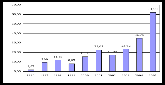 Тем не менее, несмотря на политическую нестабильность, согласно отчёту за 2005 г. Государственной Комиссии по ценным бумагам и фондовому рынку (ГКЦБФР), выпуск ценных бумаг, зарегистрированный в 2005 г. и равняющийся 61.99 миллиардам гривен, является самым высоким показателем с начала регистрации украинских ценных бумаг (рис. 2.2.4). Объём выпущенных бумаг в 2005 г превышает тот же показатель 2004 г. на 78 %, что является наибольшим темпом роста за всё время существования фондового рынка на Украине.