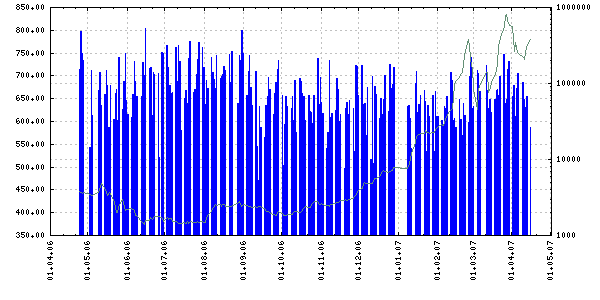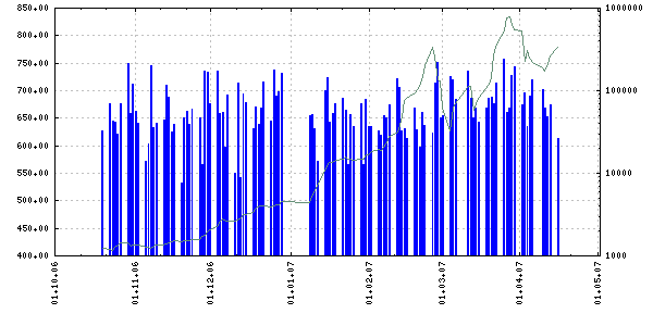 Рис. 2.3.1 Индекс ПФТС и показатель объёма торгов за 180 дней