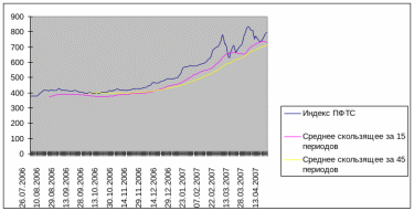 На рисунке 2.3.3 представлены средние скользящие индекса ПФТС за 15 и 45 периодов. Превышение значения индекса как показателей средней, рассчитанной за 15 периодов, так и средней, рассчитанной за 45 периодов, говорит о тенденции рынка расти дальше как в краткосрочном, так и в долгосрочном периодах. Причём значительное расстояние между показателем индекса и средней с шагом в 45 периодов выглядит особенно обнадёживающе. Обратим внимание на то, что в декабре 2006 года средняя скользящая с меньшим шагом пересекла снизу вверх среднюю с большим шагом, что является сигналом к росту рынка. И действительно, как мы видим на графике, начался длительный рост индекса, который привёл его к показателю в 800.