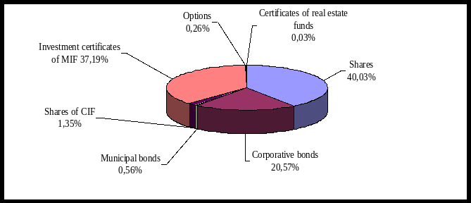 Среди выпущенных финансовых инструментов наибольший объём занимают акции (40,03 %), инвестиционные сертификаты институтов совместного инвестирования (37,19%). Остальные виды выпущенных ценных бумаг представлены на рисунке 2.2.5.