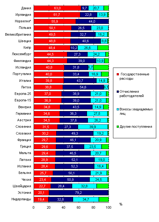 Кроме этого, некоторая часть расходов на социальную защиту финансируется за счет других поступлений (доходов от собственности, дивидендов, процентов и других поступлений). В целом по Европе-25 за счет этих средств в 2009 году было профинансировано около 3% социальных расходов. Тем не менее, в отдельных странах значение этих источников заметно выше - за счет них было профинансировано более 10% социальных расходов на Кипре и в Нидерландах, а также - за пределами Европейского Союза - в Исландии и Швейцарии.