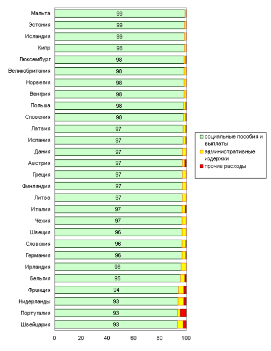 В частности, различается сама структура социальных расходов (рис. 2). Если в целом по Европе-25 на социальные пособия и выплаты в 2009 году было направлено 96,2% всех социальных расходов, то по странам-членам ЕС эта доля составляла от 93,3% в Португалии (еще выше в Швейцарии - 93,2%) до 98,8% на Мальте. Административные издержки в целом по Европе-25 составили 3,1% социальных расходов, варьируясь от 1,2% на Мальте до 4,8% в Нидерландах. Кроме того, в отдельных странах довольно значительная часть средств, направленных на социальные цели, была отнесена на другие расходы: в Португалии - 4,4% (в целом по Европе-25 - 0,7%), Швейцарии - 2,4%, Франции - 2,0%, Нидерландах - 1,8%.