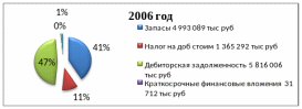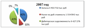 Доля запасов фирмы возросла на 20%. Больше всего изменений в запасах сырья, материалов и других аналогичных ценностей. (Увеличение с 3 715 689 тыс. руб. в 2006 до 4 501 453 тыс. руб. в 2007 году). Такое положение вещей означает определенные экономические риски для предприятия (см ниже).