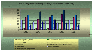 В Приложении 9 и на рис.5 постатейно приведена оценка структуры и динамики кредиторской задолженности. Доля кредиторской задолженности за товары, работы и услуги достигает максимума 16,51% на 1 января 2006 года и 1 октября 2006 года и колеблется в пределах 11, 68% - 14.94% в течении анализируемого периода. Нужно отметить, что доля задолженности перед поставщиками и подрядчиками не высока и в основном является текущей, базирующейся по отчетам ОАО «Новосибирскэнерго» на долгосрочных договорах по поставкам товаров (работ, услуг). Основную долю кредиторской задолженности составляют кредиты и займы, достигающие «пиковых» значений, соответственно 34, 23% и 27, 15% в августе 2006 года и в течении анализируемого периода имеют «лидирующие» значения. На конец рассматриваемого периода, т.е. на 01.10.2006 г. их доля снижается, соответственно до значений 25,42% и 21,22%, однако в суммовом выражении на эту дату виден значительный рост данных показателей, достигающих своего максимума. Сумма кредитов на 01.01.2006 года составляет 1 176 630 тыс.руб., а к 01.10.2006 года она вырастает до 2 905 873 тыс.руб. По займам за тот же период произошел рост с 982 154 тыс. руб. до 1 780 562 тыс.руб. Данный факт нельзя назвать отрицательным, поскольку менеджмент предприятия стремится достичь поставленных целей по развитию генерирующего комплекса не только за счет ускоренного оборота собственных средств, но и за счет привлеченных. Как видно из таблицы 14 доля краткосрочных кредитов в общей сумме кредитов на 1 октября 2006 года составляет более 50%, и в суммовом выражении имеет значение 2 556 784 тыс.руб. Стоит отметить как отрицательный факт кредиторскую задолженность перед дочерними предприятиями, несмотря на то, что ее доля и сумма в структуре кредиторской задолженности неуклонно снижается с 1 015 634 тыс.руб. до 564 897 тыс.руб. Поскольку такая ситуация не позволяет интенсивно развиваться зависимым от ОАО «Новосибирскэнерго» организациям, то соответственно негативно сказывается на ФХД головной компании.