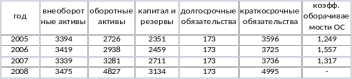 Внеоборотные активы за рассмотренный период возросли на 2,4%, а оборотные на 77,1% (табл. 7). Резервный капитал возрос на 33,3%, краткосрочные обязательства увеличились на 38,9%. Коэффициент оборачиваемости ОС с 2005 по 2007 г. увеличился на 5,44% в основном за счет увеличения выручки от реализации продукции. Незначительные долгосрочные обязательства за рассматриваемый период не изменились.