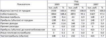 В 2005 г. предприятие потерпело убыток от продаж (-8,4% от выручки), который, тем не менее, был покрыт прочими доходами, и предприятие имело 3,1% чистой прибыли. В 2006 г. предприятие имело незначительную (0,9%) прибыль от продаж, однако чистая прибыль возросла за счет прочих доходов до 5,1%. В 2007 г. прибыль от продаж возросла до 2,7%, а чистая прибыль до 7,7%. Разница между прочими доходами и прочими расходами составила 11,6% (от выручки) в 2005 г., в 2006 г. сократилась до 4,2% и в 2007 г. составила 5,0%. Несложным, но весьма эффективным по своим аналитическим возможностям является горизонтальный анализ формы № 2, предполагающий сравнение финансовых показателей с предыдущими периодами времени с целью определения тенденций в развитии предприятия. Горизонтальный анализ является дополнением вертикального анализа. При его проведении необходимо учитывать влияние инфляции на результаты прошлой деятельности.