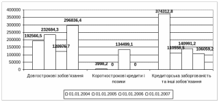 Як видно з таблиці 2.4 за 2004 – 2007 рр. позиковий капітал підприємства зменшився на 167982 тис. грн. Довгострокові зобов’язання зросли на 104269,9 тис. грн., короткострокові кредити і позики зменшились на 3998,2 тис. грн., кредиторська заборгованість – на 268254 тис. грн. Динаміка цих показників надана на рисунку 2.3