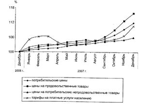 Рост цен по продовольственной группе товаров оказал наиболее заметное влияние на итоговый уровень инфляции. Следует отметить, что только в IV квартале 2007 г. темпы роста цен на продовольствие составили 109,1%, в то время как за предыдущие девять месяцев они равнялись 106,3%.