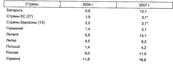 Как показывают данные табл. 3, в 2007 г. в сопредельных с Беларусью странах уровень инфляции значительно возрос по сравнению с 2006 г. Наибольший рост потребительских цен отмечен в Латвии и Украине - 114,1 и 116,6% соответственно. Значительно превышен среднеевропейский уровень инфляции в Польше и Литве. Причем для всех этих стран характерен резкий рост цен на продовольствие, которое традиционно составляет существенную долю потребительской корзинки именно в странах Восточной Европы.