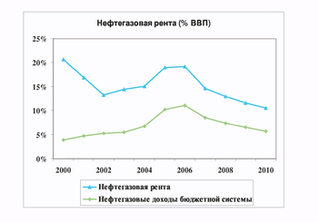 Не дивлячись на це, вибухове розширення припливу іноземного капіталу викличе подальше реальне зміцнення рубля, що скорочує питому вагу експортноорієнтованих галузей у ВВП. У результаті розміри нафтогазового комплексу, включаючи видобуток, переробку і транспортування, стабілізуються на рівні 210-220 млрд. дол., а їх доля у ВВП швидко падатиме: з 23% в 2006 р. до 13% в 2010 р. Відповідно, розрахункова величина природної ренти в нафтогазовому секторі скоротиться майже удвічі — з 19,1% ВВП в 2006 р. до 10,6% ВВП в 2010 р., як і вилучення нафтогазової ренти в бюджетну систему (див. мал. 1).