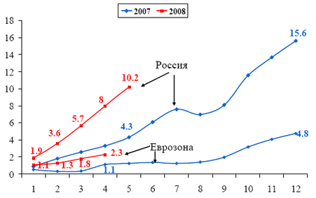 Для замедления роста цен Банком России в 2008 г. были предприняты меры по ужесточению денежно-кредитной политики. С начала года три раза повышалась ставка рефинансирования (общее повышение составило 0,75%), дважды принималось решение об увеличении нормативов отчислений коммерческих банков в фонд обязательного регулирования