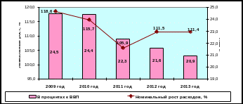 Рисунок 7. Расходы государственного бюджета в процентах к ВВП и их номинальный рост в 2009 – 2013 годах