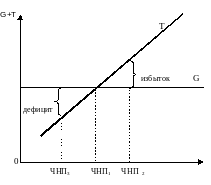 Дж. Кейнс особое значение придавал недискреционной бюджетно-налоговой политике, которая, по его мнению, способна амортизировать кризис. Встроенная стабильность возникает вследствие наличия функциональной зависимости между налогами и национальным доходом. Так, величина собираемого чистого налога варьируется пропорционально величине чистого национального продукта (ЧНП), следовательно по мере изменений уровня ЧНП возможны автоматические колебания (увеличение или уменьшение) размеров налоговых поступлений и возникающих бюджетных дефицитов и излишков. (рис.1)