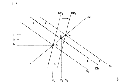 В модели IS-LM-BP увеличение совокупного спроса, происходящее в результате стимулирующей бюджетно-налоговой политики, сдвигает кривую IS вправо до положения IS2 и повышает доход до уровня Y2 (рисунок 3). Более высокий уровень дохода означает и большие объемы импорта, что ведет к образованию дефицита торгового баланса. И хотя возросшая до уровня i2 ставка процента обеспечивает дополнительный приток капитала в страну, однако в условиях низкой мобильности капитала основное влияние на состояние платежного баланса оказывает изменение текущего счета. Поэтому в целом платежный баланс сводится с отрицательным сальдо. Этому состоянию экономики соответствует точка B, лежащая правее (ниже) графика BP.При плавающем курсе, как только начинает формироваться дефицит платежного баланса, автоматически происходит снижение стоимости национальной валюты. Падение курса валюты стимулирует увеличение чистого экспорта, что приводит к дальнейшему возрастанию совокупного спроса и сокращению дефицита платежного баланса, а это сдвигает вправо как кривую IS, так и кривую BP до положения IS3 и BP2 соответственно. [12, c. 252]