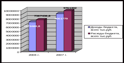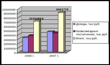 По данным таблицы 13 и рисунка 6 можно сделать следующие выводы. Общая сумма доходов увеличилась в 2007 году по сравнению с 2006 годом на 1983290 тыс. руб. или на 28% и достигла уровня 9061779 тыс. руб.