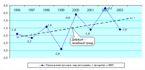 Невзирая на увеличение бюджетного дефицита в 2003 году до 1,6% ВВП в целом за последние восемь лет сохраняется тенденция роста бюджетной сбалансированности, что хорошо видно по линии тренда, которая направлена вверх. Однако конкретно по годам для бюджетного дефицита присуща значительная амплитуда колебаний в пределах 0,2-2,9% ВВП.