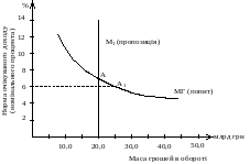 Криві попиту (МГ) і пропозиції (М1) перетинаються в точці А, якій адекватні маса грошей в обороті на суму 20,0 млрд грн та ставка очікуваного доходу (номінального процента) на рівні 8%. Це значить, що економічні суб’єкти в даній ситуації бажають мати у своєму розпорядженні грошей на суму 20,0 млрд грн, а банківська система може забезпечити пропозицію грошей на цьому ж рівні, щоб урівноважити попит і пропозицію. За цієї умови ставка процента (очікуваного доходу) стабілізується на рівні 8%. Цей рівень є рівноважною ставкою процента, яка буде задовольняти вимоги обох сторін ринку: покупці зможуть сформувати потрібний їм запас грошей, що дорівнює 20,0 млрд грн, і будуть його тримати на руках, а продавці зможуть розмістити наявний у них запас грошей за прийнятною ставкою процента.