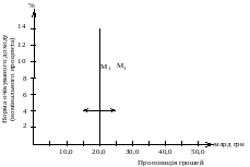Пряма вертикальна лінія, проведена з точки 20,0, свідчить про те, що фактична пропозиція грошей склалася на рівні 20,0 млрд грн і банківська система планує підтримувати її на цьому рівні незалежно від зміни процентної ставки. Якщо буде прийнято рішення за тих же умов збільшити пропозицію грошей до 25,0 млрд грн, то крива пропозиції зміститься вправо в точку, адекватну 25,0 млрд грн, але залишиться у вертикальному положенні, що свідчить про її незалежність від зміни процентної ставки.