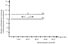 Горизонтальна лінія М1 проведена з точки 8, свідчить про те, що пропозиція грошей (точка А) повинна змінювати своє положення вліво чи вправо на горизонтальній прямій М1 (залежно від зміни попиту на гроші) так, щоб утримувати процентну ставку на рівні 8%. Якщо ж як ціль монетарної політики буде встановлено підтримання процентної ставки на рівні 10%, то лінія пропозиції грошей переміститься вгору в точку 10, але збереже горизонтальне положення.