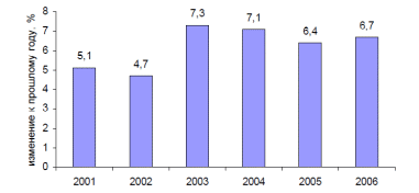 Динамика прироста ВВП наглядно представлена на рисунке 4. В последние 3 года наблюдается довольно стабильный прирост ВВП; так, согласно рисунку 4, за 2003 и 2004 гг. прирост составил свыше 7%, что свидетельствует о сохранении общего экономического роста. Но также стоит отметить, что в 2005 и 2006 гг. темп прироста составил ниже 7%. На снижении динамики сказалось влияние ряда негативных факторов (ускорение инфляции, издержек, замедление темпов прироста экспорта, торможение роста инвестиций и потребления, давление конкурирующего импорта). Однако этот показатель выше по сравнению с ведущими экономически развитыми странами мира [17, с. 25].