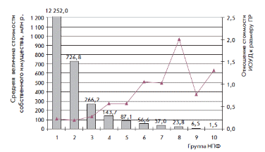 Качество работы НПФ во многом зависит от рациональности управления собственными ресурсами. НПФ — лидеры, относящиеся к первым пяти группам, а также близкие к ним по величине рассматриваемого показателя НПФ девятой группы демонстрируют эффективное управление собственным имуществом: они в основном стараются разместить поступившие финансовые ресурсы в пенсионные резервы с тем, чтобы направлять их на инвестиционные цели, а не использовать на осуществление текущей деятельности фонда. Для НПФ данных шести групп характерно превышение размера ПР над стоимостью ИОУД, чаще всего в 2 раза, тогда как НПФ, входящие в шестую—восьмую и десятую группы, имеют превышение стоимости ИОУД над размером ПР, и в НПФ восьмой группы данный показатель достигает 2,01. Превышение стоимости ИОУД над размером ПР свидетельствует о нерациональной финансовой политике НПФ, которые либо недавно появились в системе негосударственного пенсионного обеспечения и до сих пор в ней не освоились, либо проводят излишне осторожную инвестиционную политику. В восьмой, наименее экономически эффективной, группе велика доля региональных НПФ, большинство из которых еще не производили пенсионные выплаты застрахованным в них лицам. Стоимость собственного имущества в данной группе варьирует в интервале 11,4-31,7 млн р., и большая часть его не направляется НПФ в пенсионные резервы, а остается в их текущем управлении.
