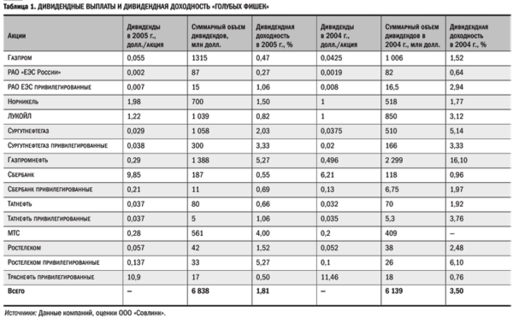 Заметно ухудшили свою дивидендную политику государственные РАО «ЕЭС России» и Транснефть. Дивидендная доходность привилегированных акций РАО «ЕЭС России» упала по итогам 2005 г. до 1% против 3% в 2004 г. Транснефть уменьшила размер дивидендов до 17 млн. долл. против 18 млн. долл. в прошлом году.