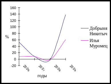Инвестора в первую очередь интересует информация о приросте паев фондов, которая раскрывает картину эффективности деятельности управляющей компании. По ежегодным отчетам, например, управляющей компании "Тройка Диалог" можно посмотреть динамику доходности двух различных по направлениям вложений ПИФов "Добрыня Никитич" и "Илья Муромец" (рисунок 2).