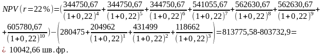 Сума річних амортизаційних відрахувань – 124272 шв.фр. Прибуток оподатковується у розмірі 16,8% (загальна сума федерального податку – 9,8% + 7% кантонального податку). Підприємство розраховує отримати віддачу від власних вкладень фінансових ресурсів в розмірі 12% (керівництво підприємства розглядає цей інвестиційний проект стосовно зміцнення конкурентних позицій на ринку). Є достовірна інформація про втрату в 7 році конкурентами своїх ринкових позицій, тому підприємство вважає за доцільне перейти на двозмінний графік роботи. що надасть можливість збільшити обсяги виробництва продукції.