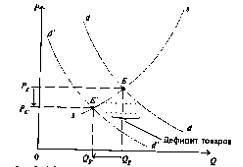 Предположим, что государство устанавливает цену товара ниже равновесной, возникает стабильный дефицит товара. Предположим, что введен новый налог на производителей, это вызовет сдвиг кривой производителя. При этом равновесная цена увеличится. Рост цены произойдет частично за счет сокращения производства, частично за переложение налогового бремени на потребителя.