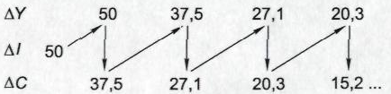 Проиллюстрируем действие мультипликатора на абстрактном примере. Если, положим, величина национального дохода составит 400 ден. ед., предельная склонность к потреблению – 0,75, а автономные инвестиции – 100 ден. ед., то равновесное состояние экономики будет представлено следующей функциональной зависимостью: 400 = 0,75*400 + 100. В результате действия научно-технического прогресса, согласно будущим ожиданиям инвесторов, прирост инвестиций ∆I составил 50. На эту же величину произойдет и первичное увеличение дохода, что, в свою очередь, вызовет рост потребительских расходов на С = ∆y*x*трс = 50*0,75 = 37,5.