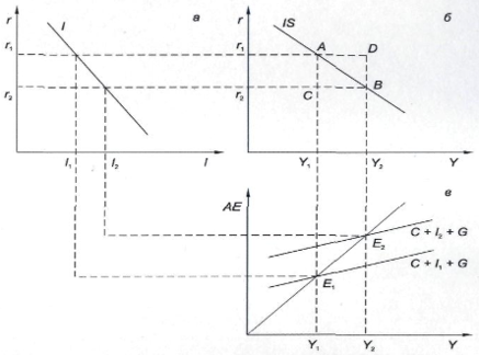 При уровне процентной ставки г} объем планируемых инвестиций составит 1г. Соответственно, совокупные расходы АЕ будут равны C+I1+G рис. 1.6б). Кривая совокупных расходов, пересекаясь с биссектрисой, определит точку равновесия E1 и равновесный объем дохода Y1, Таким образом, при процентной ставке r1 равновесным будет доход Y1. Эти параметры определят точку А (рис. 1.6в). [12, c. 162]