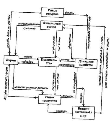 Схема взаимодействия между решениями домашних хозяйств о расходах и решениям фирм по поводу производства остается прежней, хотя и усложняется: с помощью трансфертов, субсидий, налогов и других экономических инструментов государство регулирует колебания в уровнях производства, занятости и инфляции. [13, c. 179]