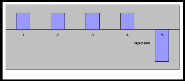 3. Инвестиционные проекты аккумуляторного типа представляют собой ряд последовательных вложений и последующий приток, как правило, однократный. В большинстве случаев проекты этого типа имеют определенный «срок жизни», заканчивающийся моментом притока денежных средств. Графическое представление платежного ряда такого проекта с равными объемами первоначальных вложений приведено на рис. 3. Основное отличие проектов этого типа, как следует из названия, заключается в способности аккумулировать денежные средства в течение длительного времени с целью их последующего однократного извлечения для получения дохода. В отдельных случаях поток доходов может распространяться на несколько интервалов планирования.