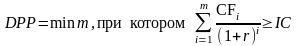 Одним из недостатков критерия PP является игнорирование им фактора времени. Для предопределения этого недостатка разработали модификацию показателя PP, известную как дисконтированный срок окупаемости инвестиции (Discounted Payback Period, DPP) и предусматривающий расчет числа базисных периодов, за которое произойдет возмещение сделанных инвестиционных расходов с учетом фактора времени. Соответствующая расчетная формула, построенная на базе DCF-модели, имеет вид: