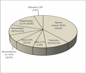 Рис.А - Географическая структура иностранных инвестиций, поступивших в РФ в I квартале 2009 г. (в скобках предоставлены данные за I квартал 2008 г.)