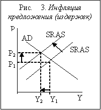 Если инфляция вызвана сокращением совокупного предложения (что происходит в результате увеличения издержек), то такой тип инфляции называется инфляцией издержек (cost-push inflation). Инфляция издержек ведет к уже известной нам ситуации стагфляции – одновременному спаду производства и росту уровня цен (рис. 3.)