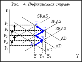 Рабочие снова начнут требовать повышения номинальной заработной платы. Ее рост рабочие обычно поначалу воспринимают как повышение реальной заработной платы и увеличивают потребительские расходы. Совокупные расходы растут, кривая совокупного спроса сдвигается вправо до AD3, уровень цен возрастает до Р4. При этом растут издержки фирм, и кривая совокупного предложения сдвигается влево-вверх до SRAS3, что обусловливает еще больший рост уровня цен до Р5. Падение реальных доходов ведет к тому, что рабочие опять начинают требовать повышения заработной платы и все повторяется снова. Движение идут по спирали, каждый виток которой соответствует более высокому уровню цен, т.е. более высокому темпу инфляции (из т. А в т.В, затем в т.С, далее в т.D, потом в т.F и т.д.). Поэтому этот процесс получил название инфляционной спирали или спирали «заработная плата – цены». Рост уровня цен провоцирует повышение заработной платы, а рост заработной платы ведет к повышению уровня цен.