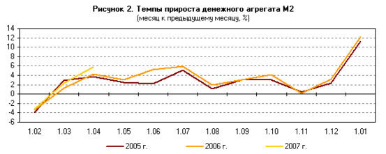 В I квартале 2007 г. темпы прироста денежного агрегата М2 оставались высокими. За январь—март рублевая денежная масса возросла на 4,6% (в I квартале 2006 г. — на 2,0%).