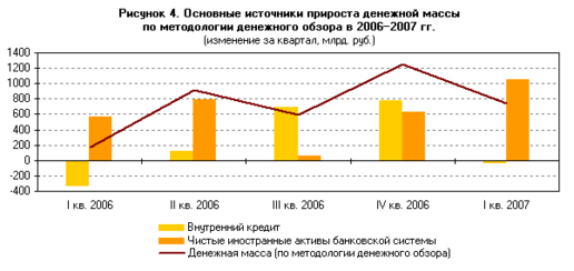 Темпы прироста денежной массы по методологии денежного обзора в январе—марте 2007 г. составили 7,4% (в аналогичный период 2006 г. — 2,4%). Прирост чистых иностранных активов банковской системы (вследствие значительного прироста чистых иностранных активов органов денежно-кредитного регулирования) являлся важным источником увеличения этого денежного агрегата. При его росте на 0,75 трлн. руб. чистые иностранные активы увеличились на 1,05 трлн. руб., а внутренний кредит экономике сократился на 0,03 трлн. руб. (в январе—марте 2006 г. аналогичные показатели составили 0,17; 0,57 и — 0,33 трлн. руб. соответственно). При этом в I квартале 2007 г. возросло значение такого источника роста денежного предложения, как банковские кредиты нефинансовым организациям и населению. Требования к этой группе заемщиков за I квартал 2007 г. в целом возросли на 0,74 трлн. руб. (за аналогичный период 2006 г. — на 0,39 трлн. руб.). Сдерживающее влияние на рост денежной массы, так же как и в 2006 г., оказывало накопление средств на счетах органов государственного управления в Банке России, главным образом на счетах Стабилизационного фонда Российской Федерации.