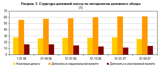 Структура рублевой денежной массы изменилась следующим образом: доля наличных денег в обращении на 1.04.2007 сократилась относительно аналогичного показателя на 1.01.2007 на 1,9 процентного пункта (до 29,1%), удельный вес депозитов "до востребования" повысился на 1,0 процентного пункта (до 32,3%), доля срочных депозитов возросла на 0,9 процентного пункта (до 38,6%).
