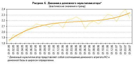 Соотношение темпов роста денежной массы М2 и денежной базы в широком определении обусловило увеличение денежного мультипликатора с 2,183 на 1.01.2007 до 2,236 на 1.04.2007, или на 2,5% (за I квартал 2006 г. — на 9,3%).