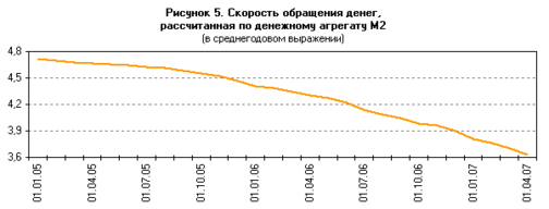 Скорость обращения денег, рассчитанная по денежному агрегату М2 в среднегодовом выражении, снизилась за I квартал 2007 г. на 4,8% (за аналогичный период 2006 г. — на 2,3%). Уровень монетизации экономики (по денежному агрегату М2) увеличился за январь—март 2007 г. с 26,2 до 27,5%.
