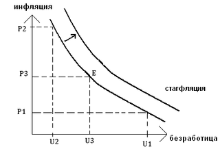 Так, увеличивая поток инвестиций, государство может побудить предприятия к расширению производства и сбыта, а значит, увеличению рабочих мест. Норма безработицы снижается до уровня U2, но одновременно темпы инфляции возрастают до Р2. Такие манипуляции могут вызвать "перегрев" экономики и как следствие кризисные явления. Такая ситуация вынуждает правительство ввести кредитные ограничения, сократить расходы из государственного бюджета и т.д. В результате этих возвратных действий правительства уровень цен снизится до уровня РЗ, а безработица возрастет и ее норма составит U3.