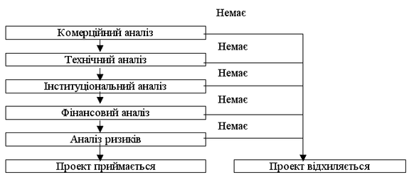 Метою управління капітальними інвестиціями ТОВ «Північноукраїнський будівельний альянс» є вибір найефективніших інвестиційних проектів і забезпечення реалізації окремих інвестиційних програм. Особлива увага приділяється вибору інвестиційних проектів, що здійснюється на основі оцінки їх ефективності при забезпеченні послідовності проведення аналізу. Прийняття або відхилення інвестиційного проекту здійснюється після проведення його аналізу за такої послідовності (рис. 2.2.1).
