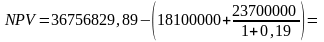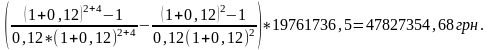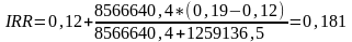 Так як k2 =0,19 і NPV2 = - 1259136,5 грн., то визначимо значення k1 , при якому NPV1>0. Припустимо, що k1= 0,12, тоді: