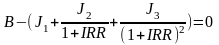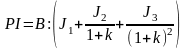 Оскільки чисті зворотні грошові потоки починаються не з 1-го року реалізації проекту, а після закінчення інвестиційної фази, то сучасне значення кумулятивного зворотного грошового потоку можна визначити, віднявши з ануїтету за весь життєвий цикл проекту ануїтет за період інвестування, коли зворотні грошові потоки відсутні, по формулі