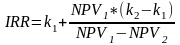 Для наближеного визначення IRR можна використовувати “метод хорди”, заснований на тім, що реальна криволінійна залежність між NPV і k замінюється прямолінійною залежністю між ними. Для реалізації цього методу необхідно установити значення k1, при якому NPV1 позитивна і значення k2, при якому NPV2 від’ємна.